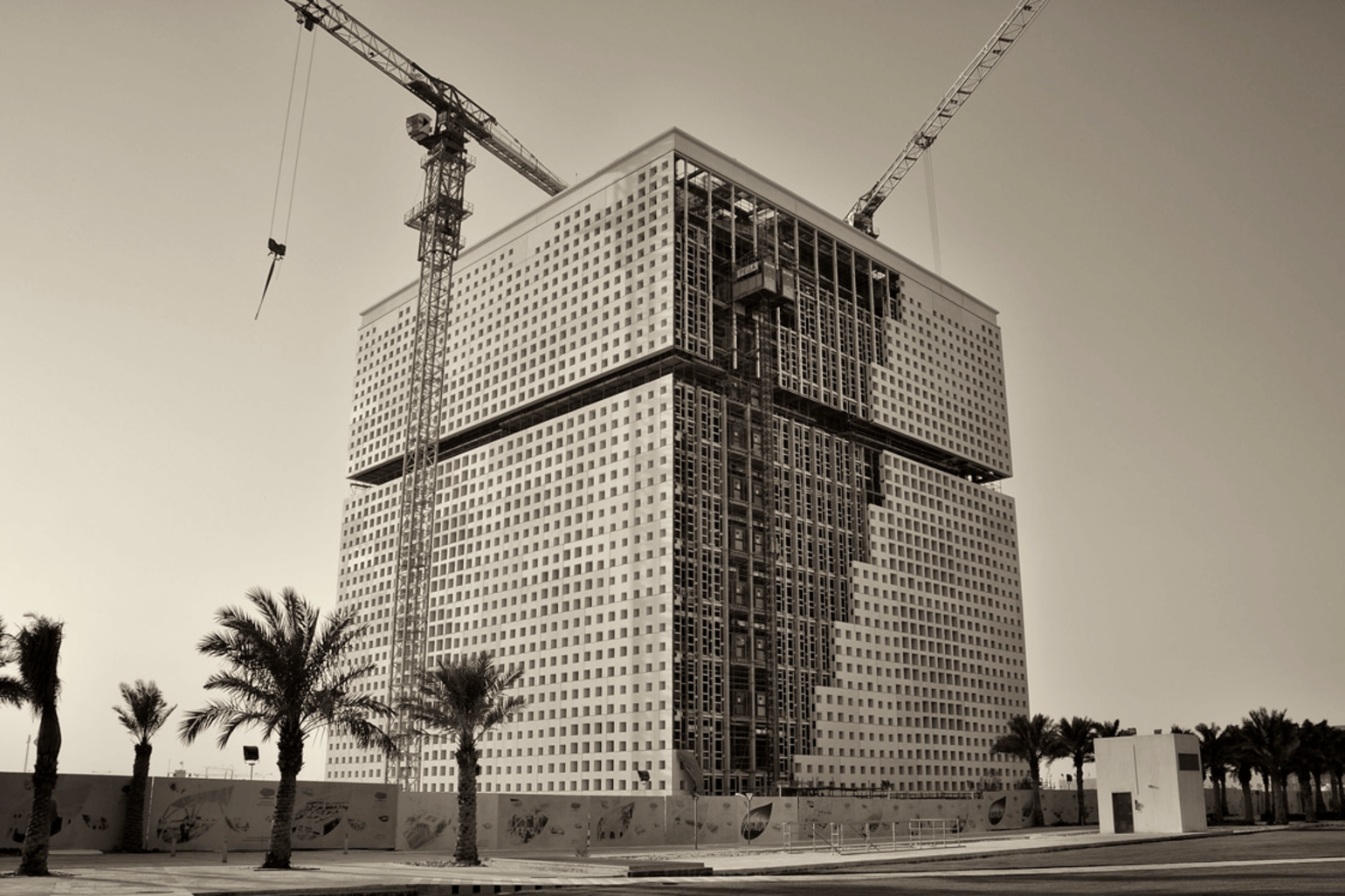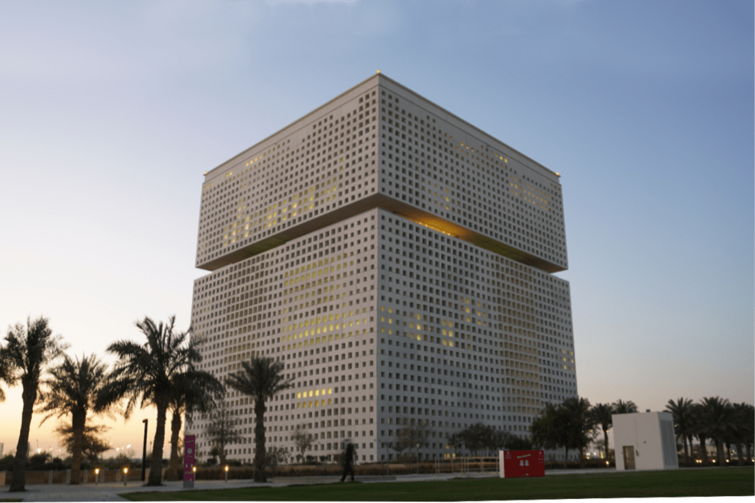 The 2015 building (Qatar Foundation Headquarters) is a wonder of structural engineering. The upper part is detached from the rest of the building at the 8th floor, where a balcony overlooks the entire campus. On the inside, two towers that are connected by sky bridges. The external facade has pixelated impressions of the Sidra tree, a symbol of healing, nourishment, and life in the desert.