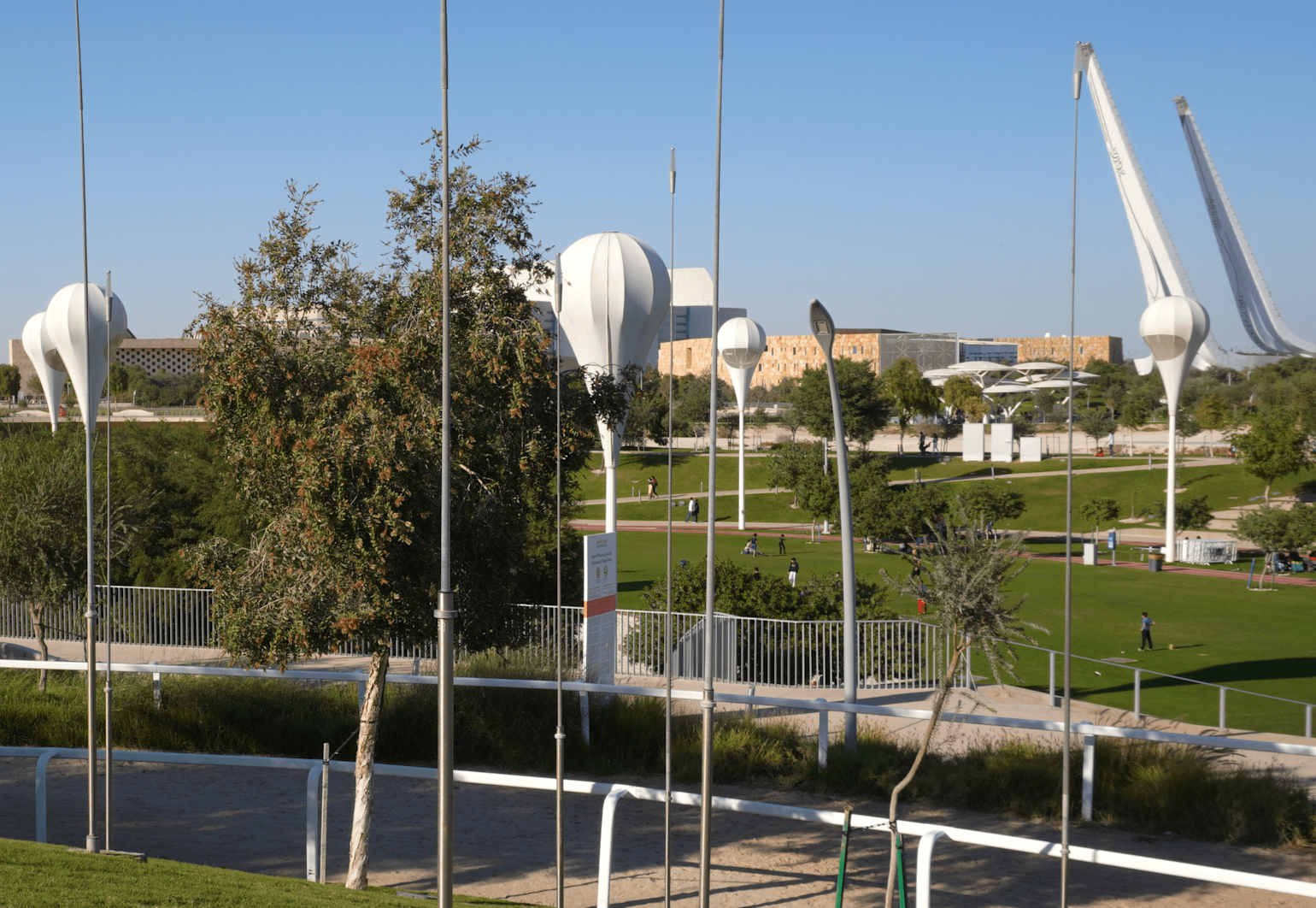 Oxygen Park is the largest green space in Education City. The design for it incorporates changes in topography that help to channel wind into the park. Within the park, there are hills of varying heights and walkways that weave up and down the lower and upper spaces. Air conditioners are also placed in the covered walkways to enhance the experience of visitors. As a result, the park is much cooler than its surrounding spaces throughout the year.