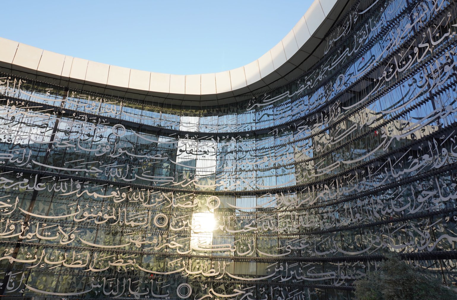 Putting calligraphy in front of the glass windows created a challenge for the designers. The sunlight reflecting off the windows cast a shadow of the verses on the ground. In order to address this, the architects placed vertical and horizontal lines in a layer behind the design. This makes the shadows on the ground illegible.
