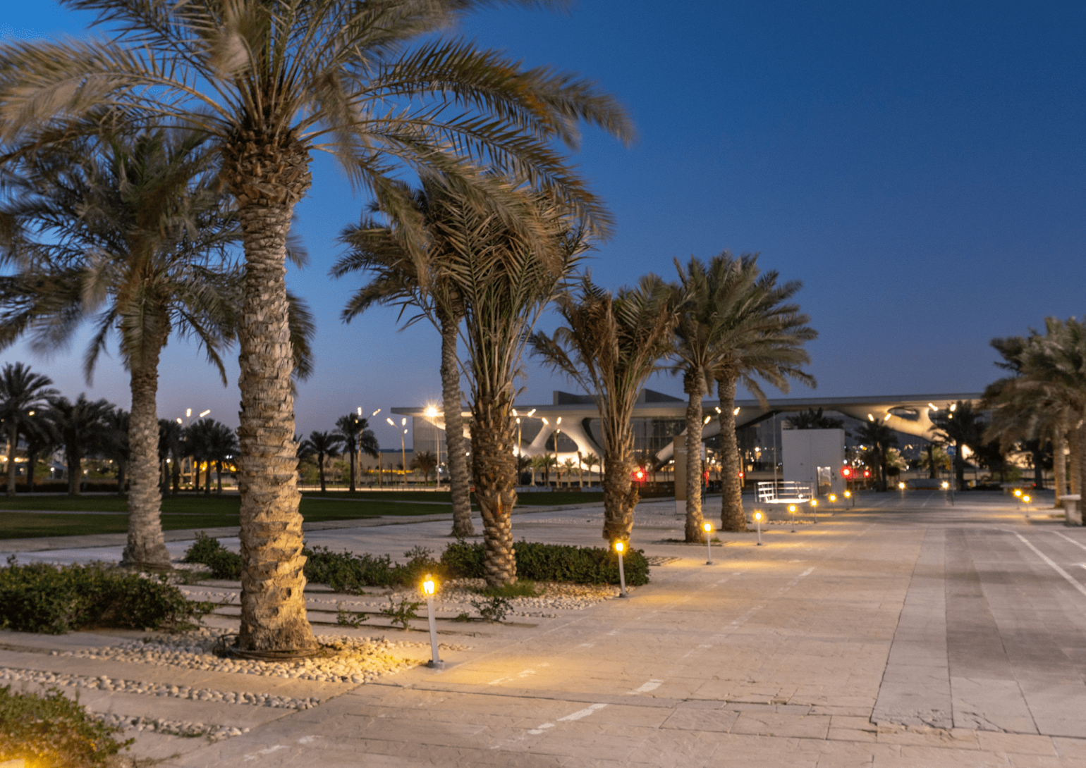The Ceremonial Green Spine was the first line drawn on Qatar Foundation’s master plan for Education City in 1992. This line connects two celebration spaces: Qatar National Convention Center, an indoor space, and the Ceremonial Court, which is outdoors. It also divides the higher education facilities of the entire campus from those that offer primary and secondary education.