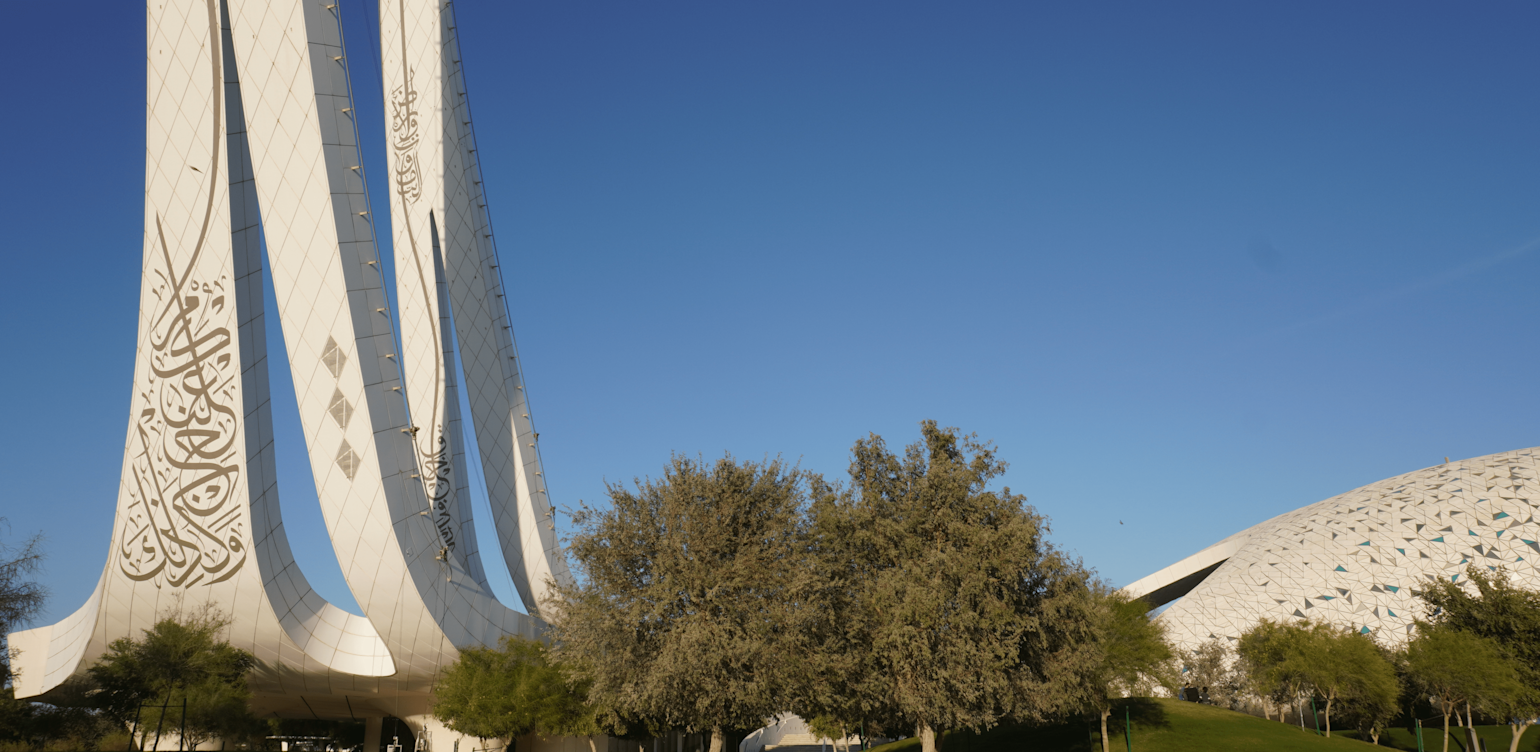 Minaretein – which houses the Education City Mosque and Hamad Bin Khalifa University’s Colleges of Islamic Studies, Law and Public Policy – features minarets that are the highest structures in Education City. They are 90 meters tall and point towards Makkah. The building rests on five main structural columns, which represent the five pillars of Islam. There are also four streams that siphon water to a garden in the center of the building. Each of these represent the four rivers of Paradise promised in the Qur’an: water, honey, milk and wine.